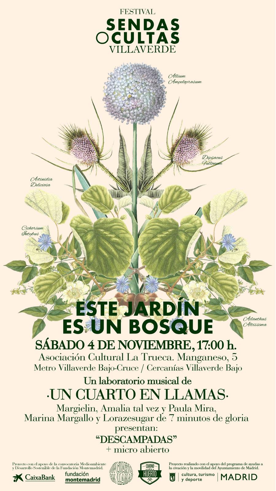 “Este jardín es un bosque”, un laboratorio musical de Un cuarto en llamas con la presentación de “Descampadas”, una pieza creada de manera colaborativa por jóvenes artistas. ¿Qué hago si me siento perdida? ¿Cómo reconocer un bosque en potencia? ¿Se pueden ver las estrellas desde la ciudad? Margielin, Amalia tal vez, y Paula Mira, Marina Margallo y Lorazesugar de 7 minutos de gloria, nos narran una historia mezclando ritmos y estilos en un escenario biodiverso.